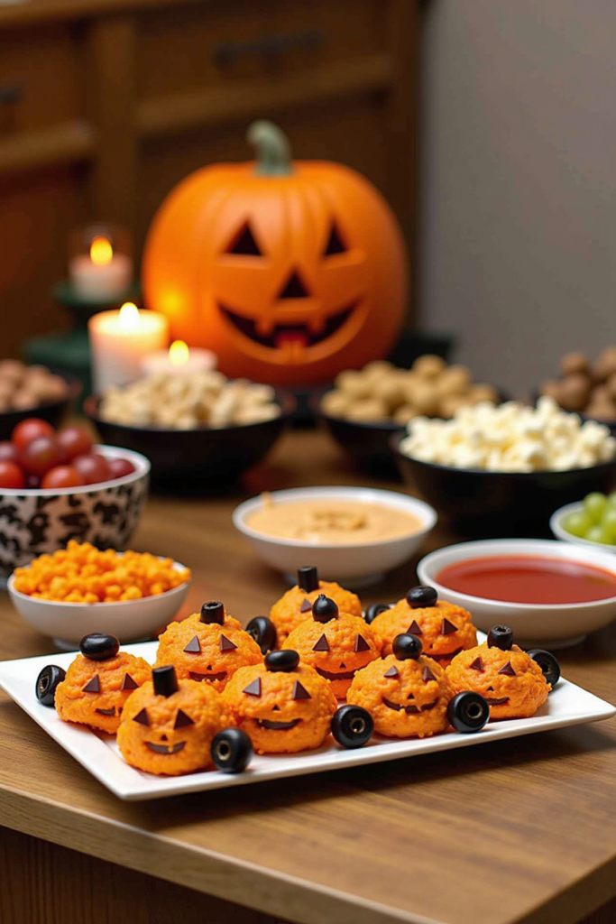 - Creepy-Cute Cheese Balls – Mini cheese balls with almond “teeth” and olive “pupils,” served with crackers.