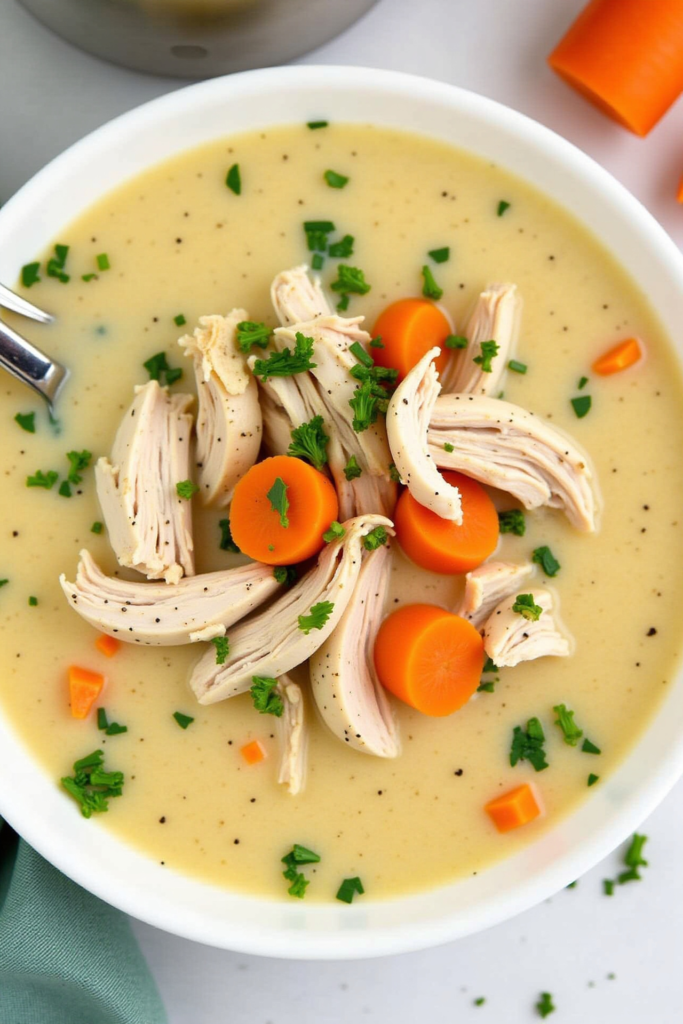 Once the veggies are fork-tender and the chicken is cooked through, add peas and corn for a burst of sweetness and color. Shredded chicken goes back into the soup, and the Greek yogurt (or light cream cheese) is whisked in just before serving, creating a comforting, creamy consistency. Garnish with fresh parsley and a sprinkle of black pepper for a vibrant finish.