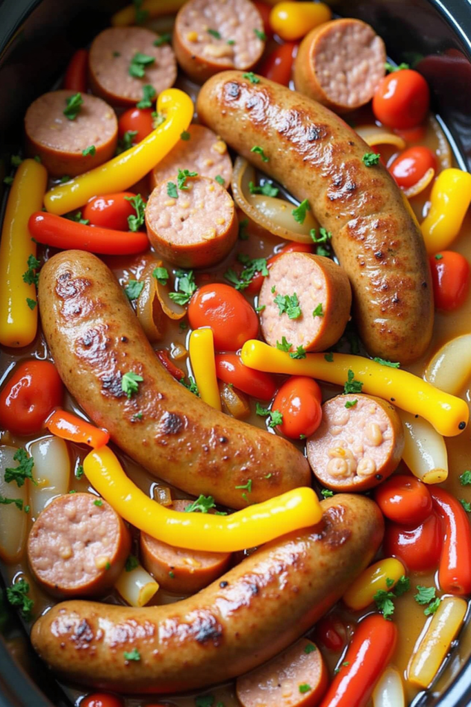 6. Cover and cook on LOW for 6–7 hours or on HIGH for 3–4 hours, until the sausages are cooked through and peppers are tender.