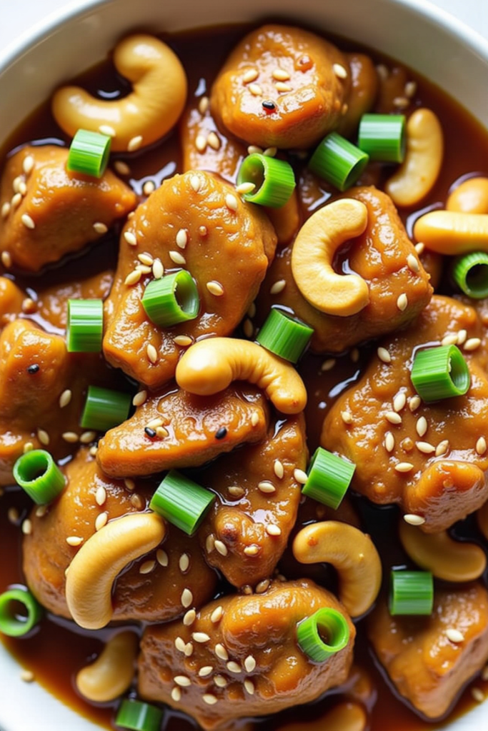 Place cubes of chicken in the slow cooker and pour the sauce over, tossing to coat evenly. About 30 minutes before serving, toss in roasted unsalted cashews, allowing them to retain their characteristic crunch. For the best presentation and added nutrients, top with sliced green onions and sesame seeds just before serving.